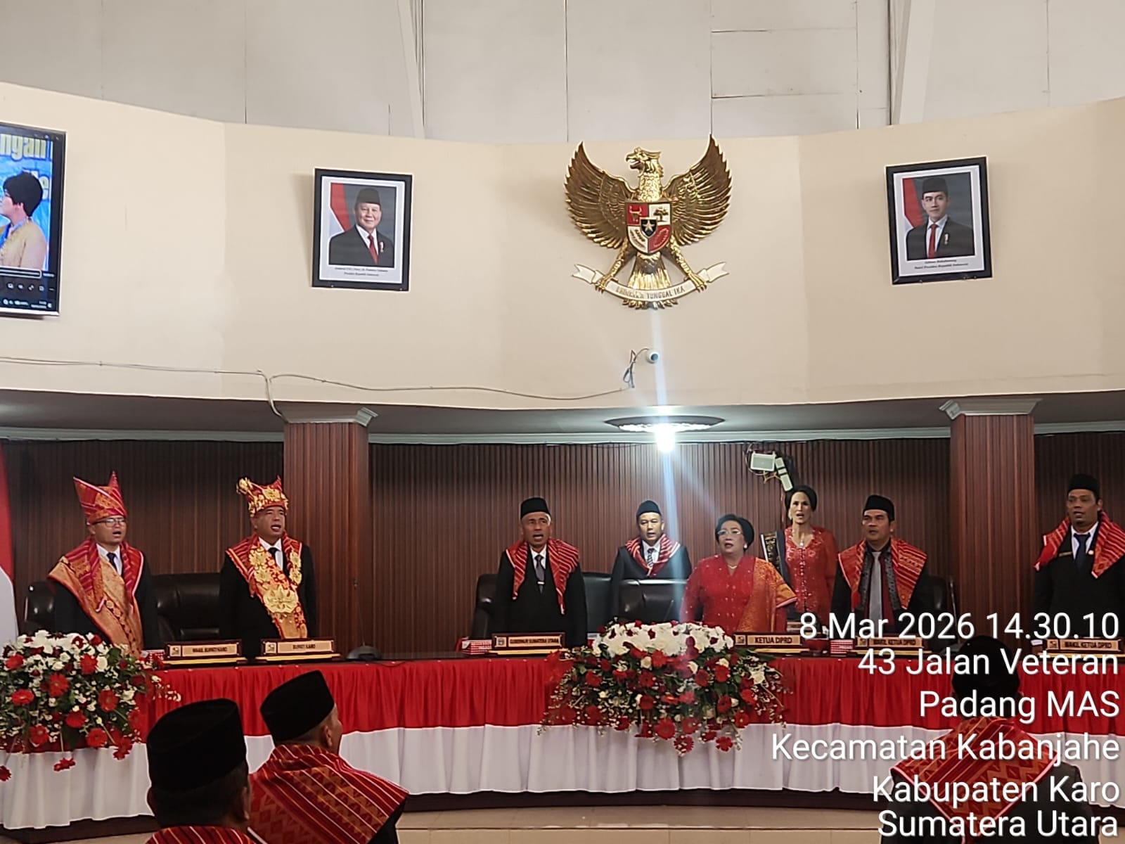 KARO -MEDAN EKSPOS |Bupati Karo, Brigjen Pol (Purn) Dr. dr. Antonius Ginting, Sp.OG., M.Kes., didampingi Wakil Bupati Karo, Komando Tarigan, SP, Jajaran Fokopimda, serta Sekda Kab.Karo, Gelora Kurnia Putra Ginting, S.STP., MM., menghadiri Rapat Paripurna Dewan Perwakilan Rakyat Daerah (DPRD) Kabupaten Karo dalam rangka memperingati Hari Jadi Kabupaten Karo ke-80 yang dilaksanakan di Kantor DPRD Kabupaten Karo pada Minggu (8/3/2026).