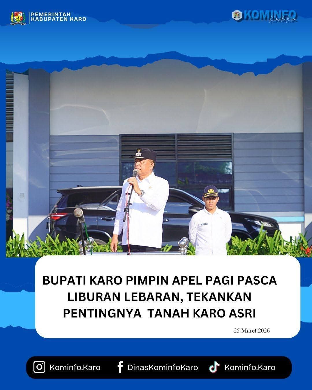 Apel pagi ini juga menjadi momentum untuk meningkatkan kinerja dan pelayanan kepada masyarakat, serta memperkuat semangat kerja sama dan kekompakan di lingkungan Pemkab Karo, sekaligus bentuk toleransi yang dalam hal ini berupa ucapan selamat Hari Raya Idul Fitri yang ke 1447 Hijriah dari Bupati Karo.