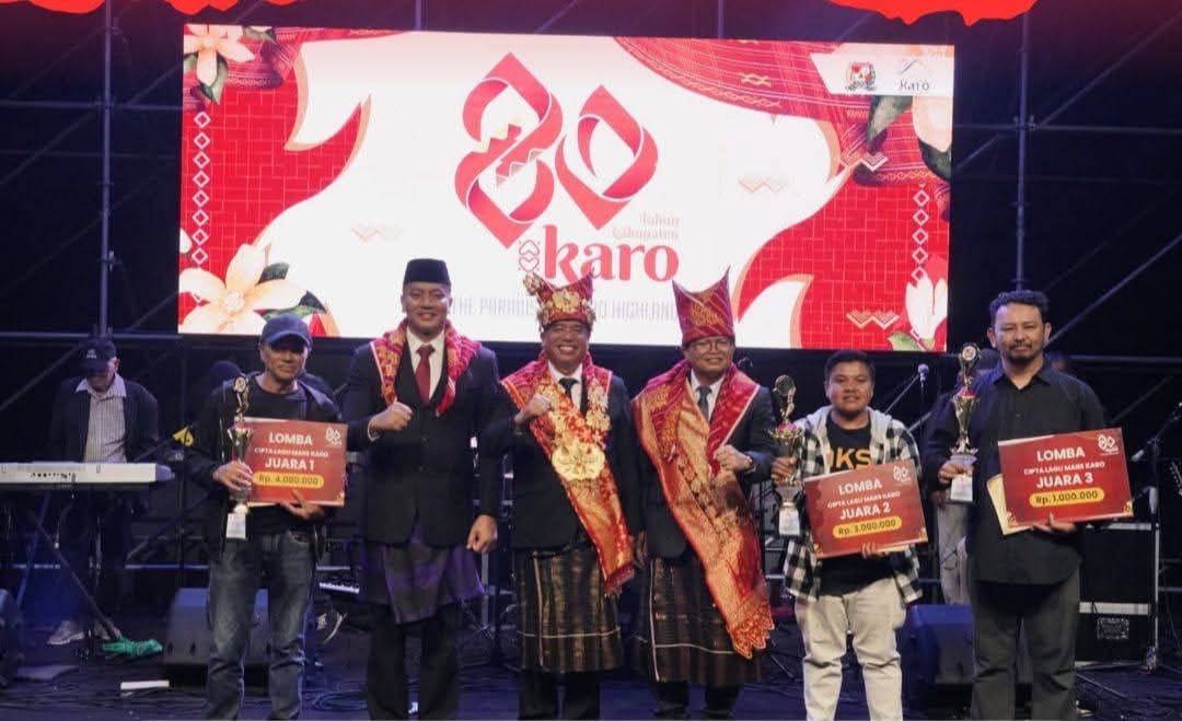 KARO -MEDAN EKSPOS.ID |Kabanjahe, 8 Maret 2026 – Bupati Karo, Brigjen Pol (Purn) Dr. dr. Antonius Ginting, S.P.OG., M.Kes, didampingi Wakil Bupati Karo Komando Tarigan,SP dan Sekda Kabupaten Karo Gelora Kurnia Putra, S.STP, MM menyerahkan hadiah kepada pemenang Lomba Cipta Lagu (Mars Kabupaten Karo) dalam rangka perayaan Hari Jadi Karo ke 80 di Lapangan Samura Kabanjahe.