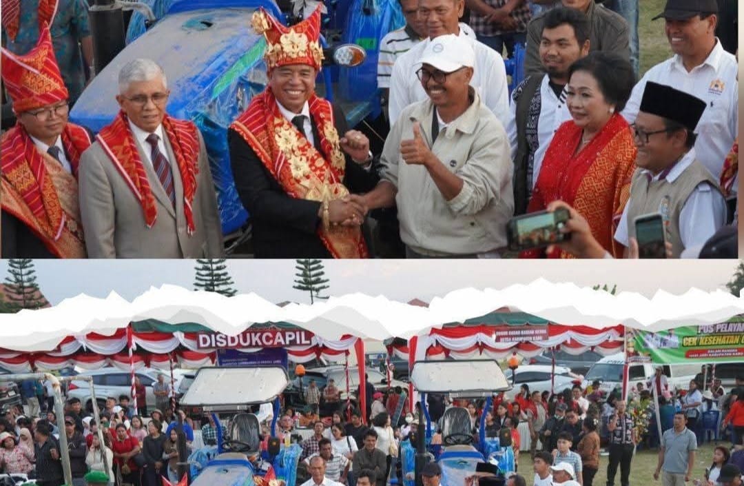 KARO –MEDAN EKSPOS.ID |Kabanjahe- Bupati Karo, Brigjen Pol (Purn) Dr. dr. Antonius Ginting, Sp. OG., M.Kes bersama Forkopimda Karo menyerahkan bantuan alat mesin pertanian (Alsintan) kepada enam kelompok tani binaan di Lapangan Samura, Kabanjahe, bertepatan dengan Hari Jadi Kab. Karo ke-80 pada tanggal 08 Maret 2026.