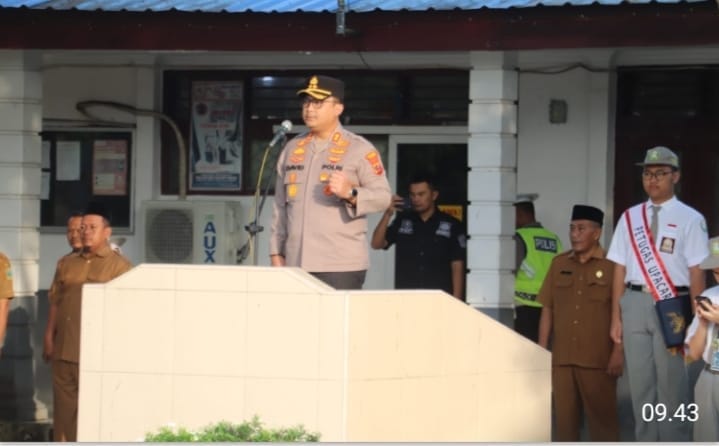 Kegiatan yang berlangsung di lapangan sekolah tersebut turut didampingi para Pejabat Utama (PJU) Polres Langkat serta dihadiri oleh Kepala Sekolah, dewan guru, tenaga kependidikan, dan seluruh siswa sebagai peserta upacara.