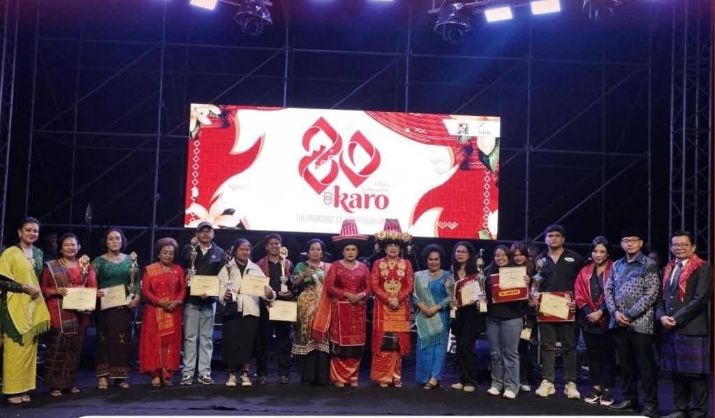 KARO –MEDAN EKSPOS |Kabanjahe, Bupati Karo, Brigjen Pol. (Purn) Dr. dr. Antonius Ginting, Sp.OG., M.Kes. yang diwakili oleh Asisten Pemerintahan dan Kesejahteraan Rakyat, Asisten Perekonomian dan Pembangunan, Asisten Administrasi Umum menyerahkan Piagam penghargaan Lomba Konten Video pada Puncak Hari Jadi Kabupaten Karo yang ke -80 yang dilaksanakan di Stadion Samura Kabanjahe (8/3/2026).