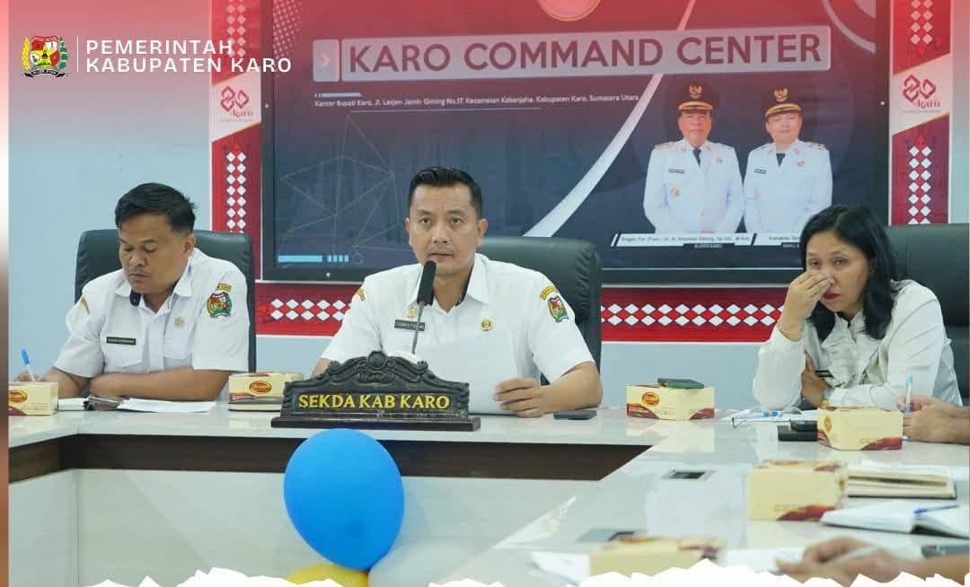 KARO –MEDAB EKSPOS |Kabanjahe – Bupati Karo, Brigjen Pol (Purn) Dr. dr. Antonius Ginting, Sp.OG., M.Kes., melalui Sekretaris Daerah Kabupaten Karo, Gelora Kurnia Putra Ginting, S.STP., MM, didampingi Kepala BKAD dan Inspektur Kab. Karo memimpin rapat percepatan penyusunan Laporan Keuangan Perangkat Daerah Tahun Anggaran 2025 yang dilaksanakan secara daring melalui Zoom Meeting di KCC Kantor Bupati Karo, Rabu (11/03/2026).
