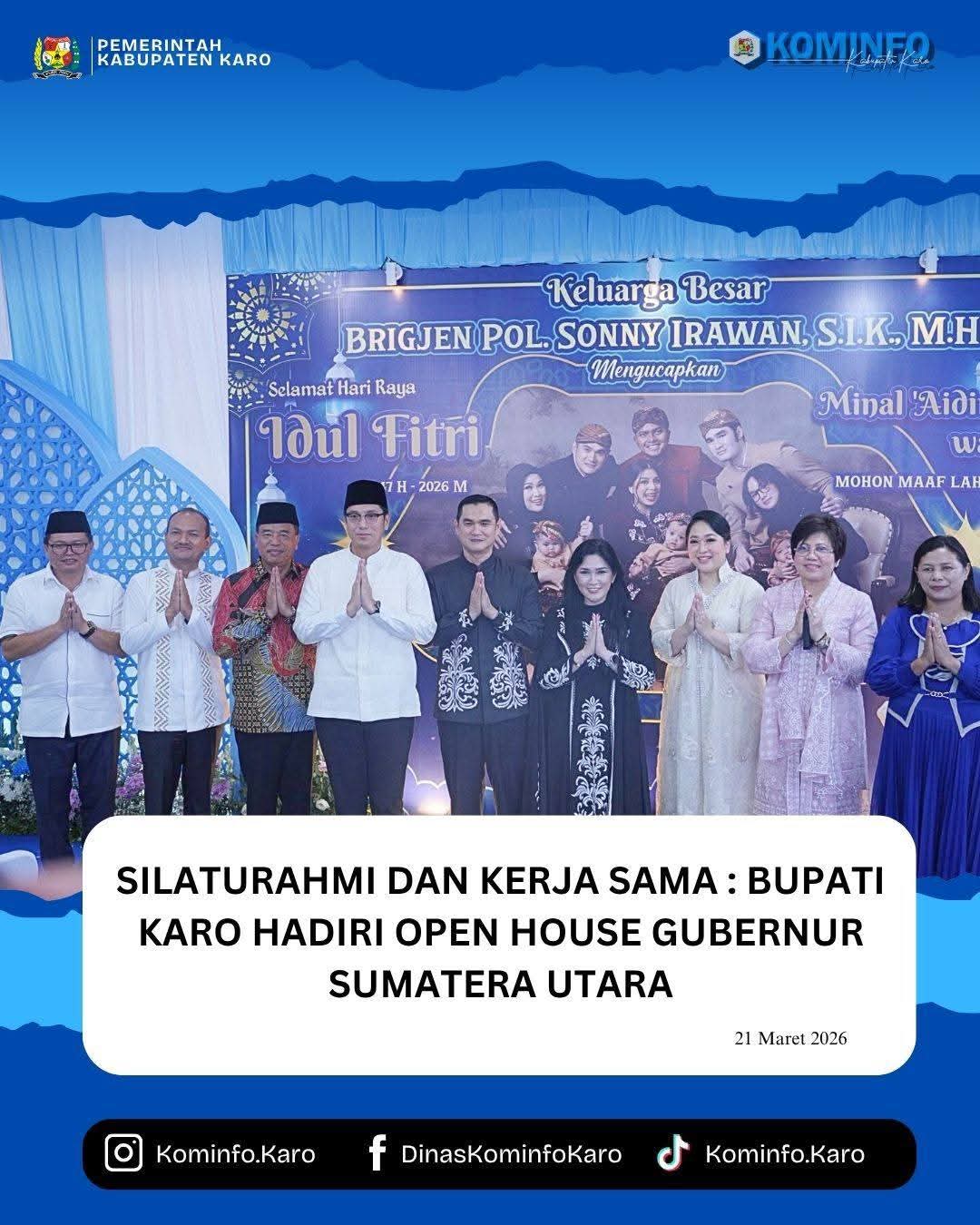 MEDAN -MEDAN EKSPOS ID |Bupati Karo, Brigjen Pol (Purn) Dr. dr. Antonius Ginting, Sp. OG., M.Kes, dan Wakil Bupati Karo, Komando Tarigan, SP, menghadiri Acara Open House Gubernur Sumatera Utara yang dilaksanakan pada hari Sabtu, 21 Maret 2026 pukul 14.00 WIB di Aula TRN Rumah Dinas Gubernur Sumatera Utara.